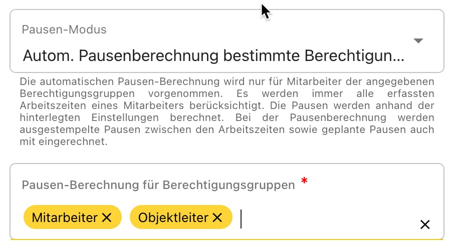 Bisher konnte man die automatische Pausenberechnung nur für einen Mandanten an oder ausschalten. Jetzt kann man die automatische Pausenberechnung auch nur für bestimmte Berechtigungsgruppen aktivieren. Zusätzlich gibt es noch die Option “Geplante Pausen berücksichtigen”, d.h. man kann die automatische Pausenberechnung mit geplanten Pausen kombinieren.